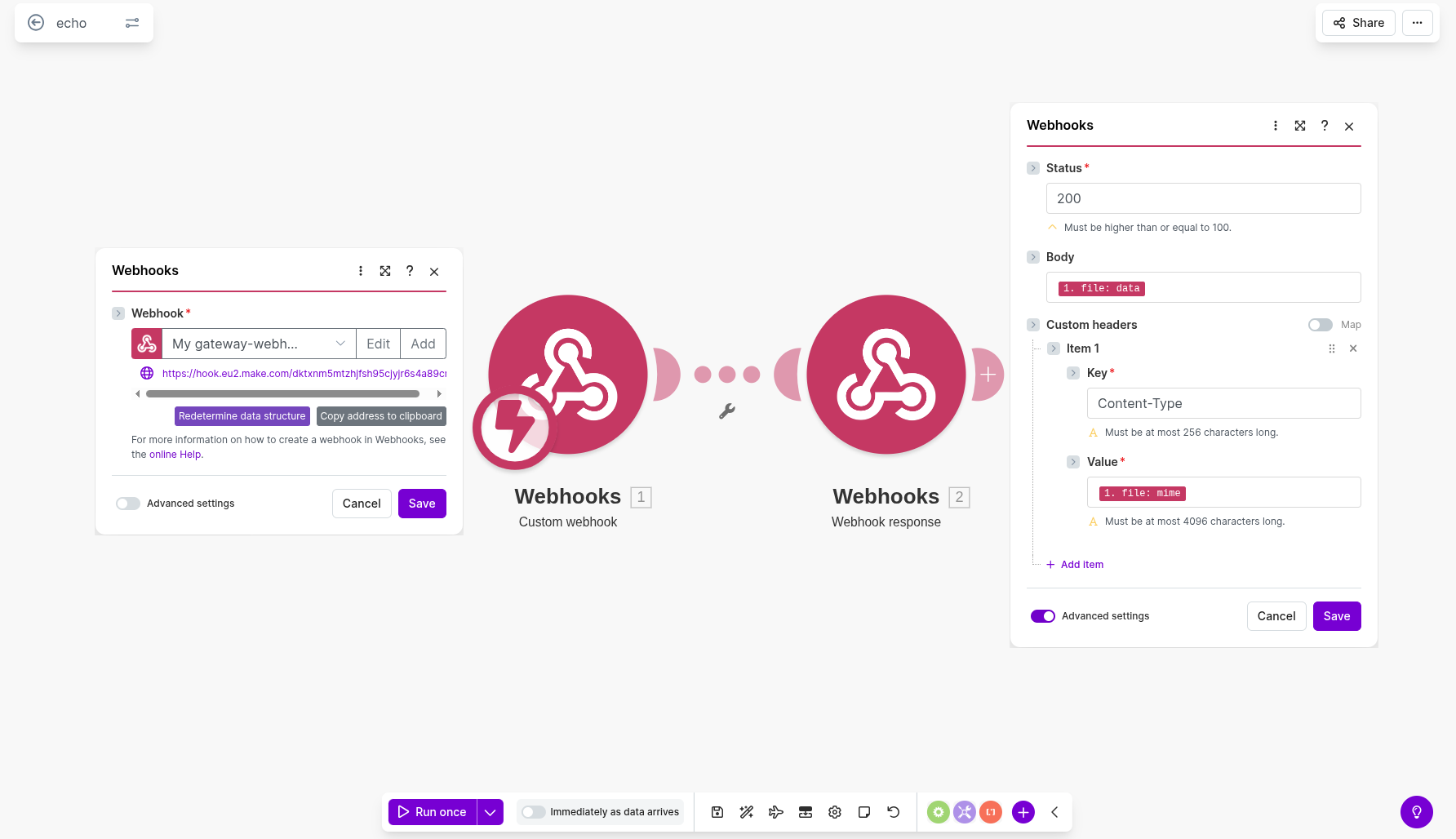 - The "Webhook Response" module requires a header so your app knows what type of data to expect. Set the Content-Type to audio, but instead of typing it manually, use the dynamic value received in the "Custom Webhook" module.