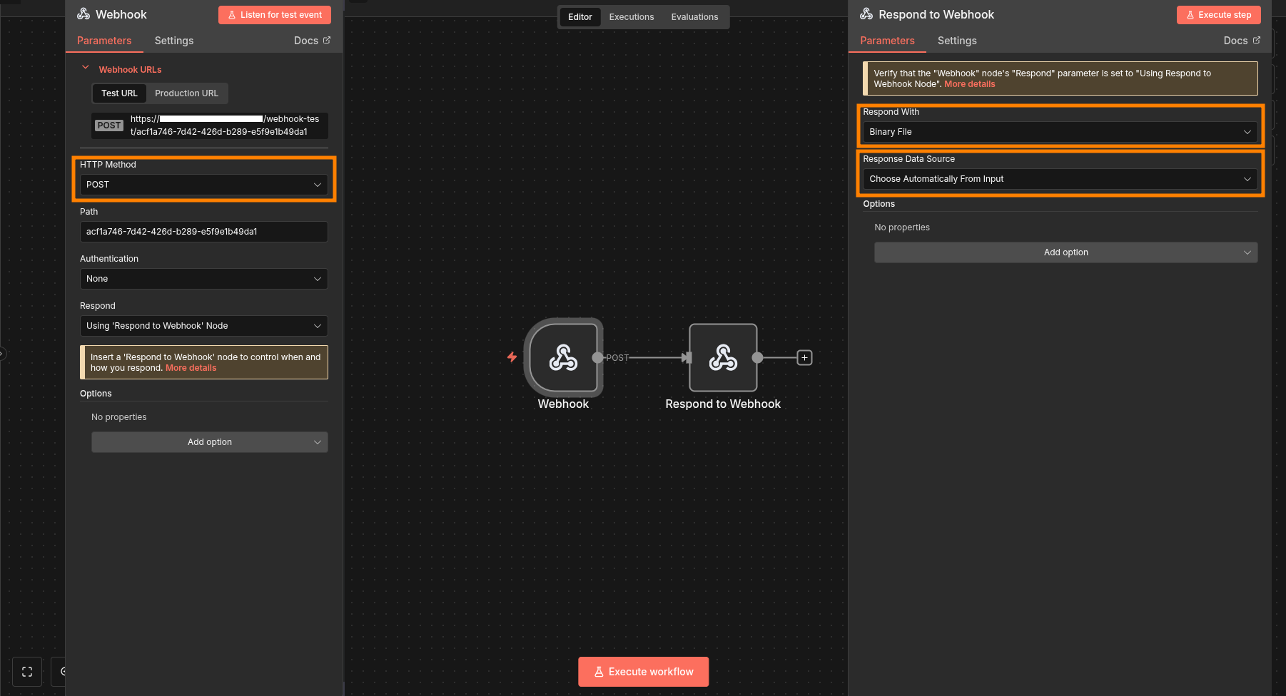 In the "Respond to Webhook" module, select "Respond with Binary Data" and set the "Response Data Source" to "Choose Automatically From Input." This ensures the automation returns exactly what it receives.