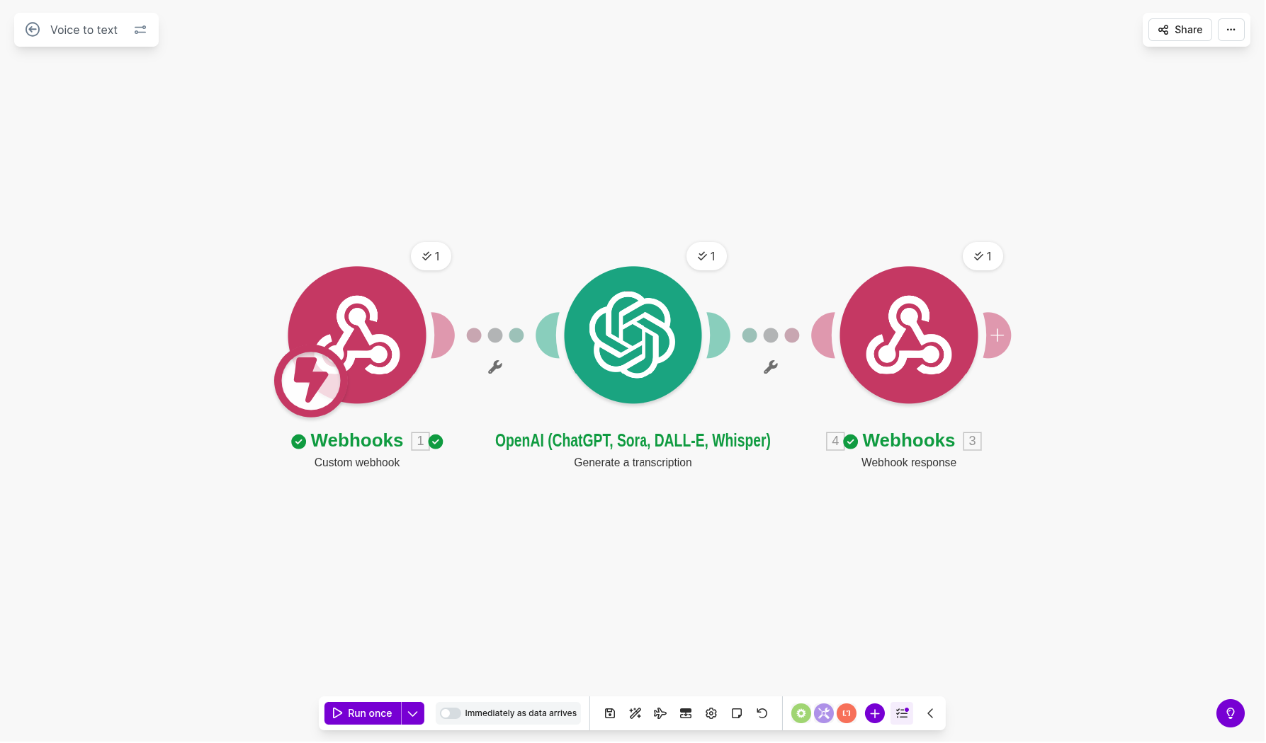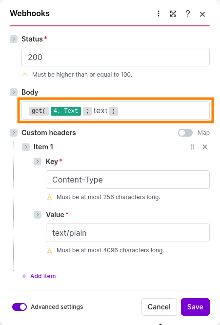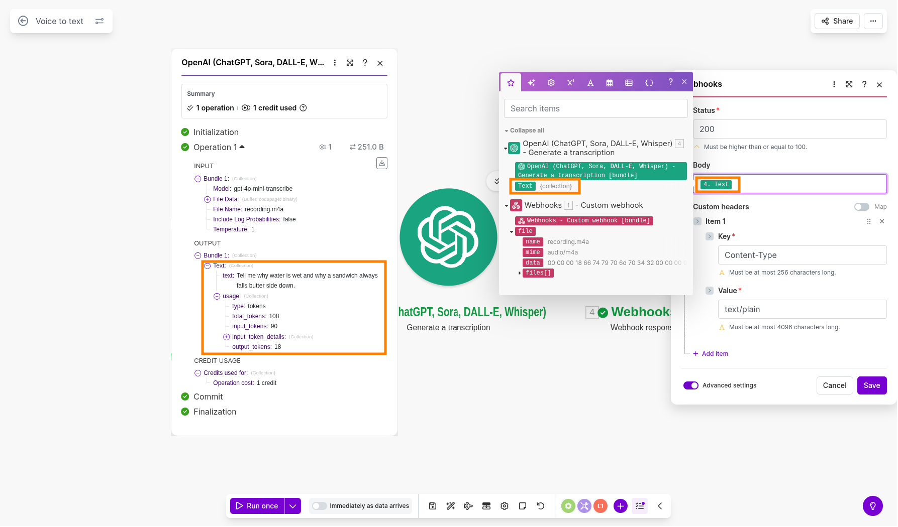 The catch is that the OpenAI module returns a data collection named "Text" rather than a plain text string. If we pass "Text" directly to the webhook response, we are effectively returning a JSON structure instead of the raw text itself. Make enables connecting data via drag‑and‑drop, but in this case there is no way to access the inner "text" field inside "Text" directly.
